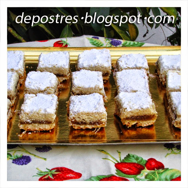 Metemos en el horno previamente caliente a 150º durante una hora. Sacamos y echamos azúcar glas encima y una vez frío, cortamos en cuadrados, para conservar, mejor liarlo en papel de seda, dura unos cuantos días.(a mi me han durado 5 días y estaban perfectos)