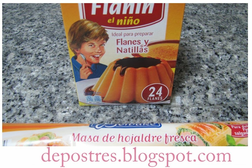 En esta ocasión los hice con los sobres de Flanin el Niño que es más rápido y use 1 sobre y medio y 1/2 litro de leche. Puedes usar la marca de preparado de Natillas que te guste, como Flan Potax, Royal, ..etc. siempre procurando que espese para poder rellenar bien los hojaldres.